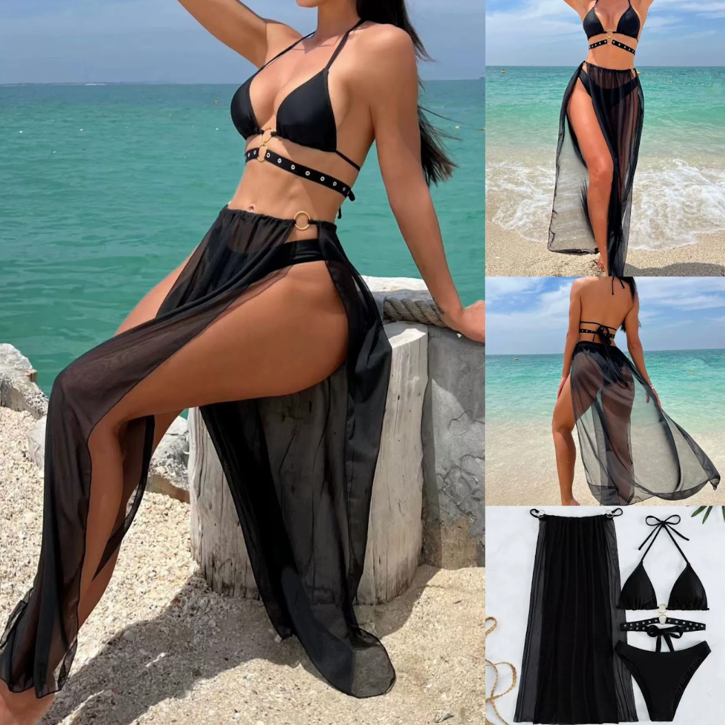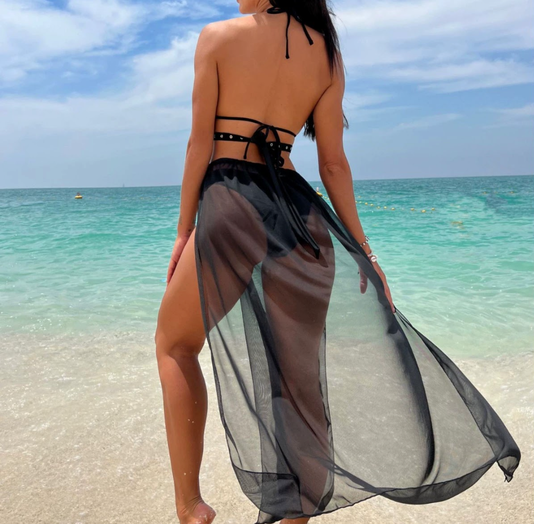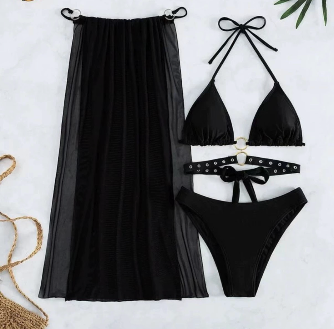 Et elegant og tidløst bikini sett med et matchende langt skjørt – laget for å kombinere komfort med stil. Det klassiske svarte uttrykket gir et rent, sofistikert preg, mens skjørtets lette fall fremhever silhuetten på en flatterende måte. Perfekt for både strand og sommerlige kvelder.