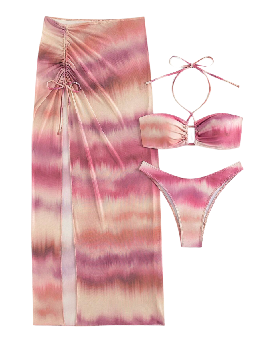 Opplev den perfekte kombinasjonen av stil og komfort med Seaside Twist sett Dette elegante strandsettet består av en justerbar bikini med X-knyting, et vridd design i midjen med elastisk strikk for en flatterende passform, samt et matchende skjørt for en sofistikert look. Perfekt for både strand og basseng!