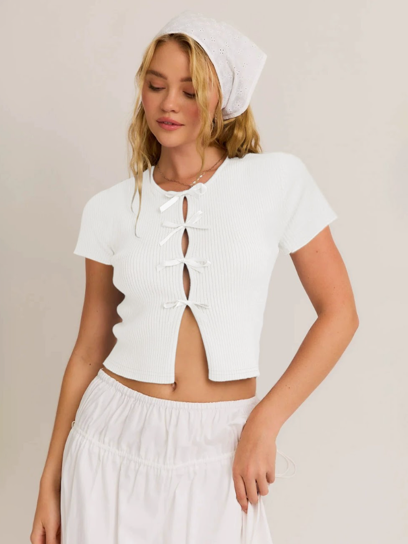 Denne feminine toppen med sløyfeknyting i midten gir et romantisk og stilrent uttrykk. Den flatterende passformen fremhever midjen, mens det myke stoffet sørger for komfort hele dagen. Perfekt å style med både bukser, skjørt og shorts for en chic og trendy look. Ideell for både hverdagsbruk og spesielle anledninger.
