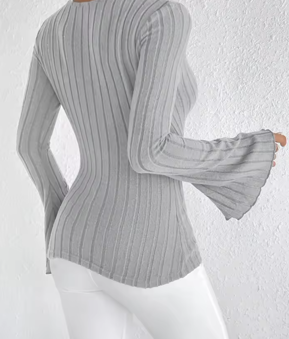 VivaFlow er en elegant og feminin langermet topp for dame, designet med en flatterende V-utringning og løse ermer helt nederst for et sofistikert, men avslappet uttrykk. Den lette og behagelige stoffkvaliteten gjør den perfekt til både hverdags og mer pyntede anledninger.