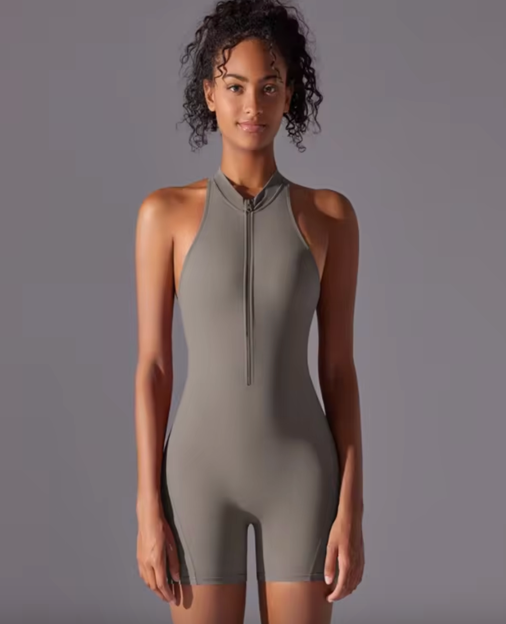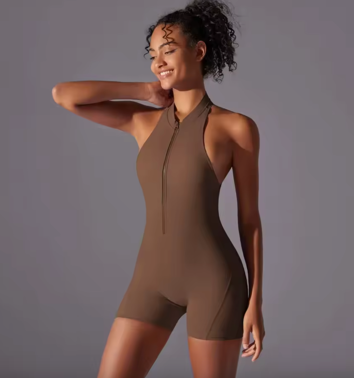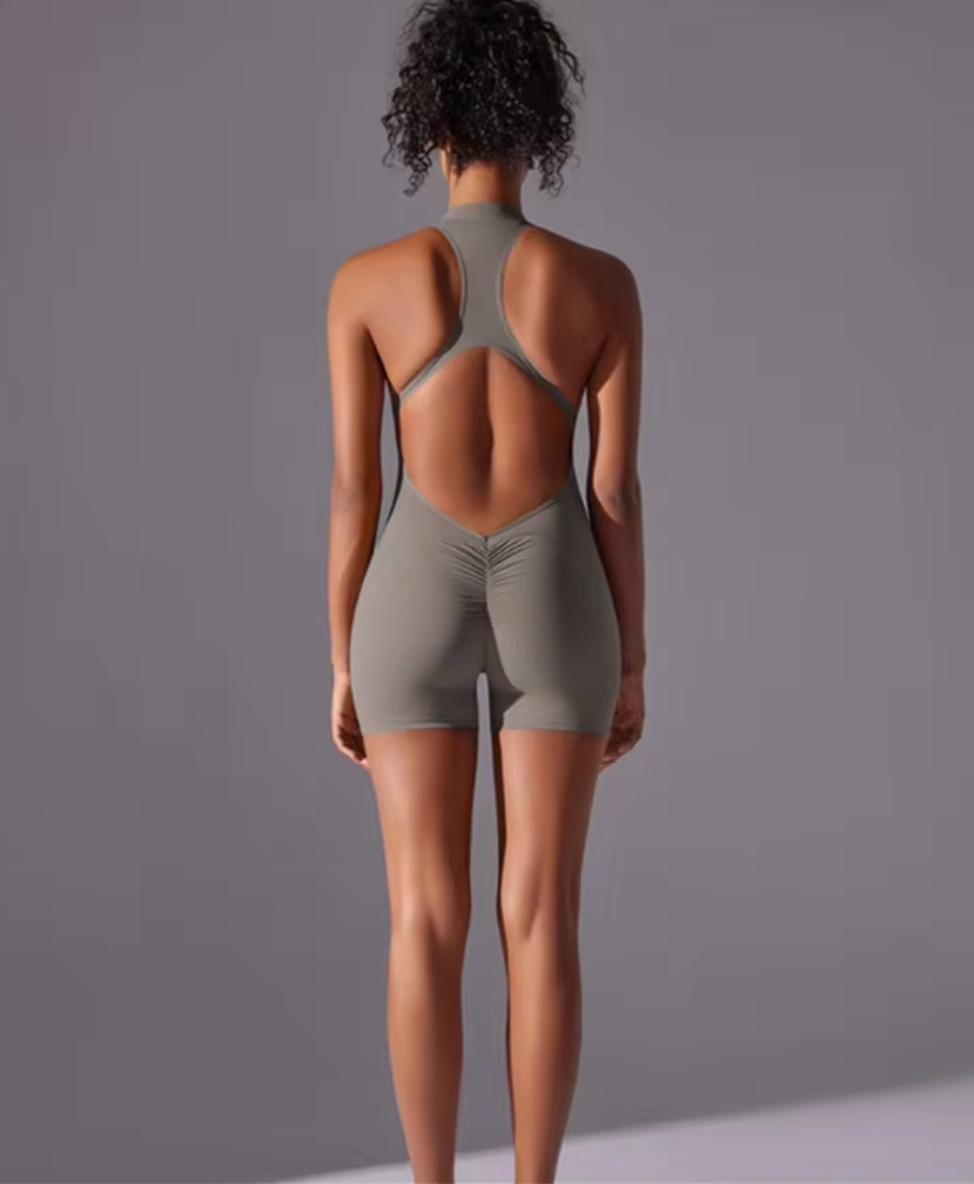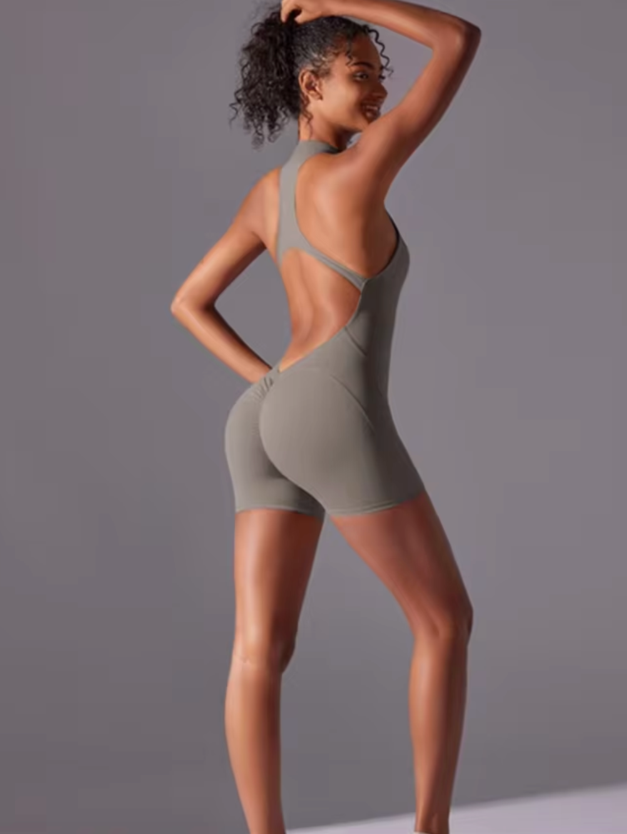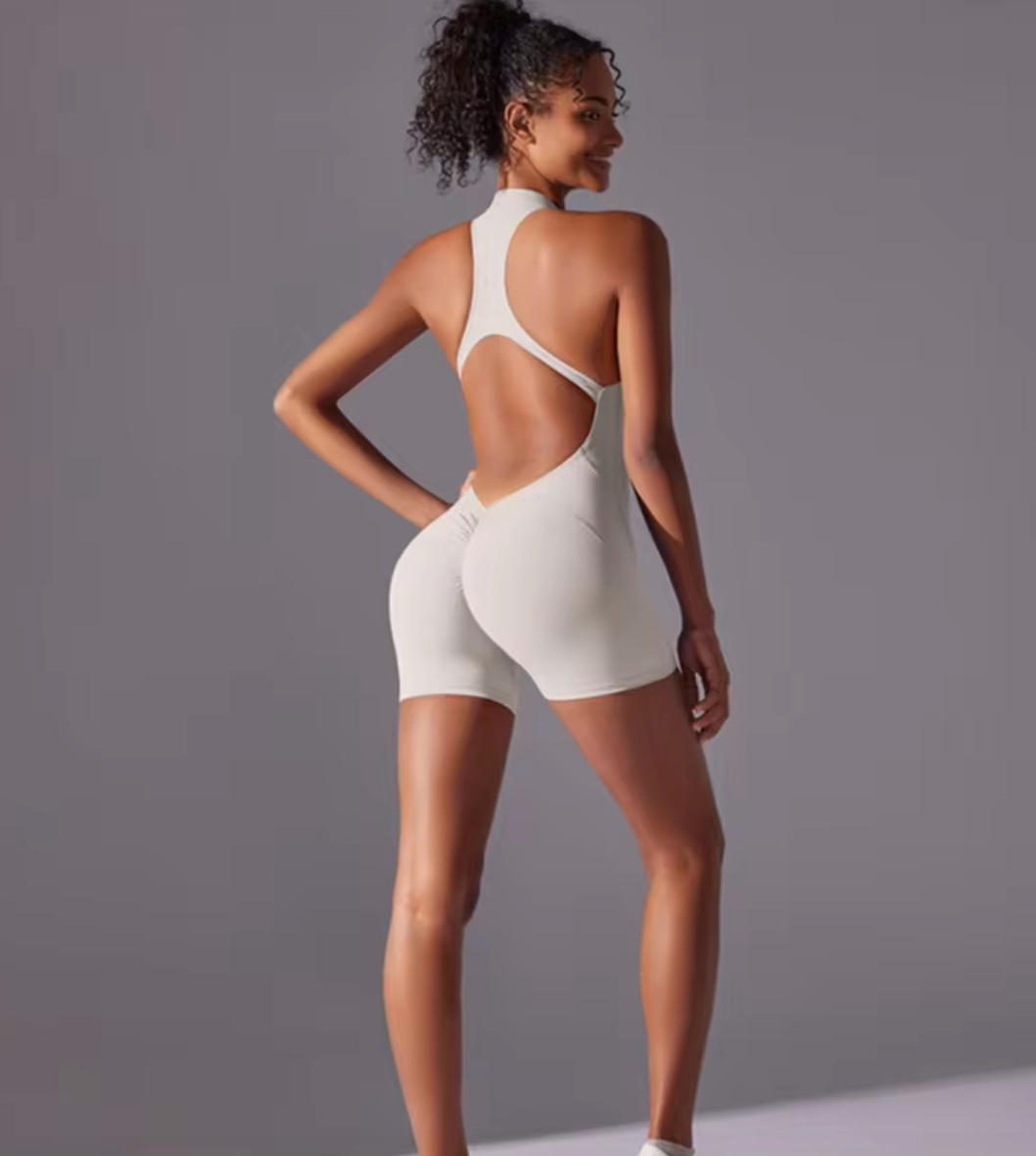 Denne stilrene treningsbodysuiten for dame kombinerer funksjon og mote i ett. Med shorts-lengde, åpen rygg og bare skuldre, gir den maksimal bevegelsesfrihet og komfort under alle typer trening – enten du driver med yoga, styrketrening, dans, pilates eller bare ønsker en sporty og moderne look til hverdags.