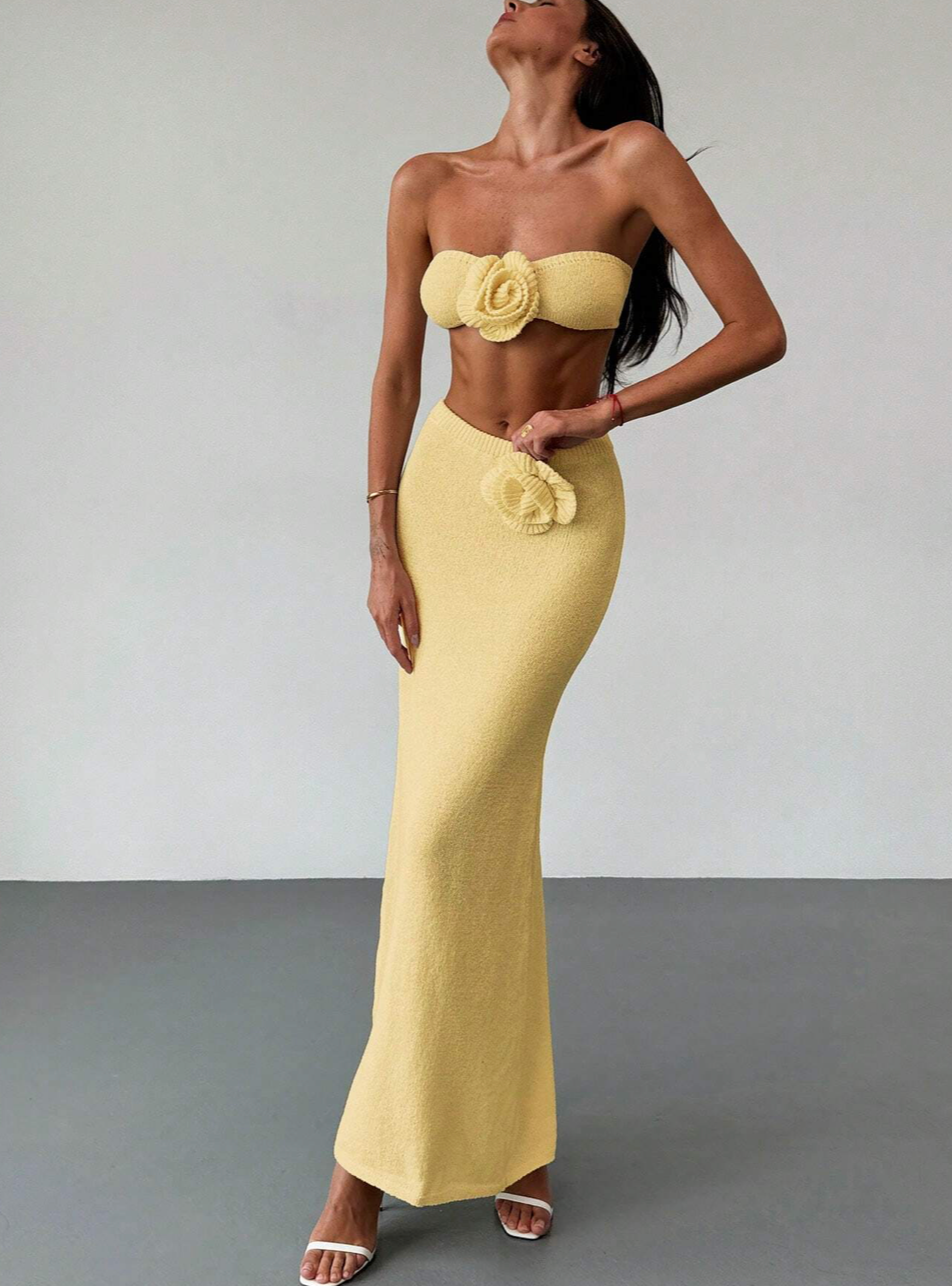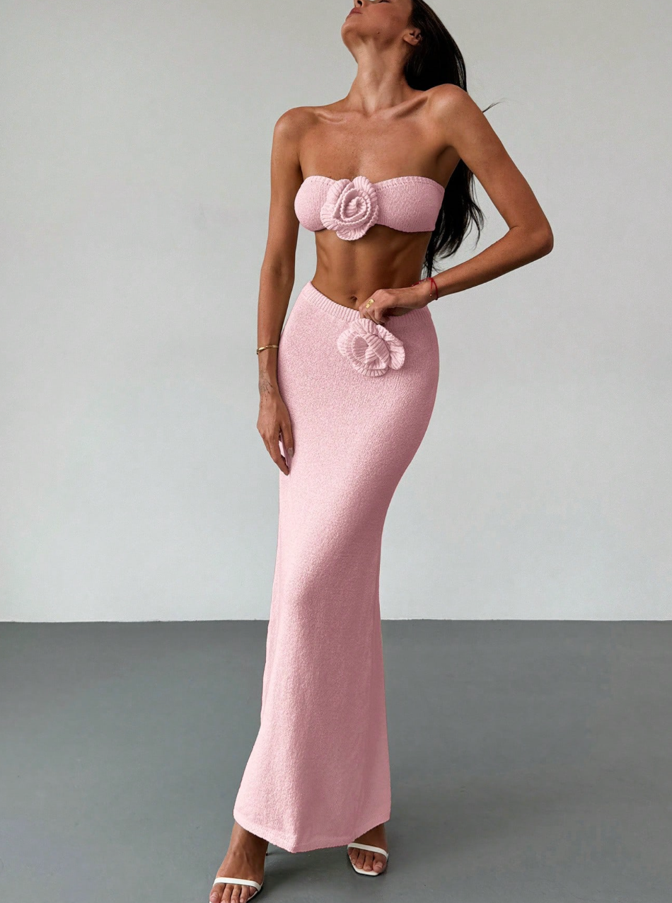 Et friskt og feminint sett perfekt for solfylte dager! Dette todelte antrekket består av en liten topp med blomster og et matchende skjørt med blomsterdetaljer på siden. Lett og behagelig materiale gjør det ideelt for både strand, by og sommerlige anledninger.