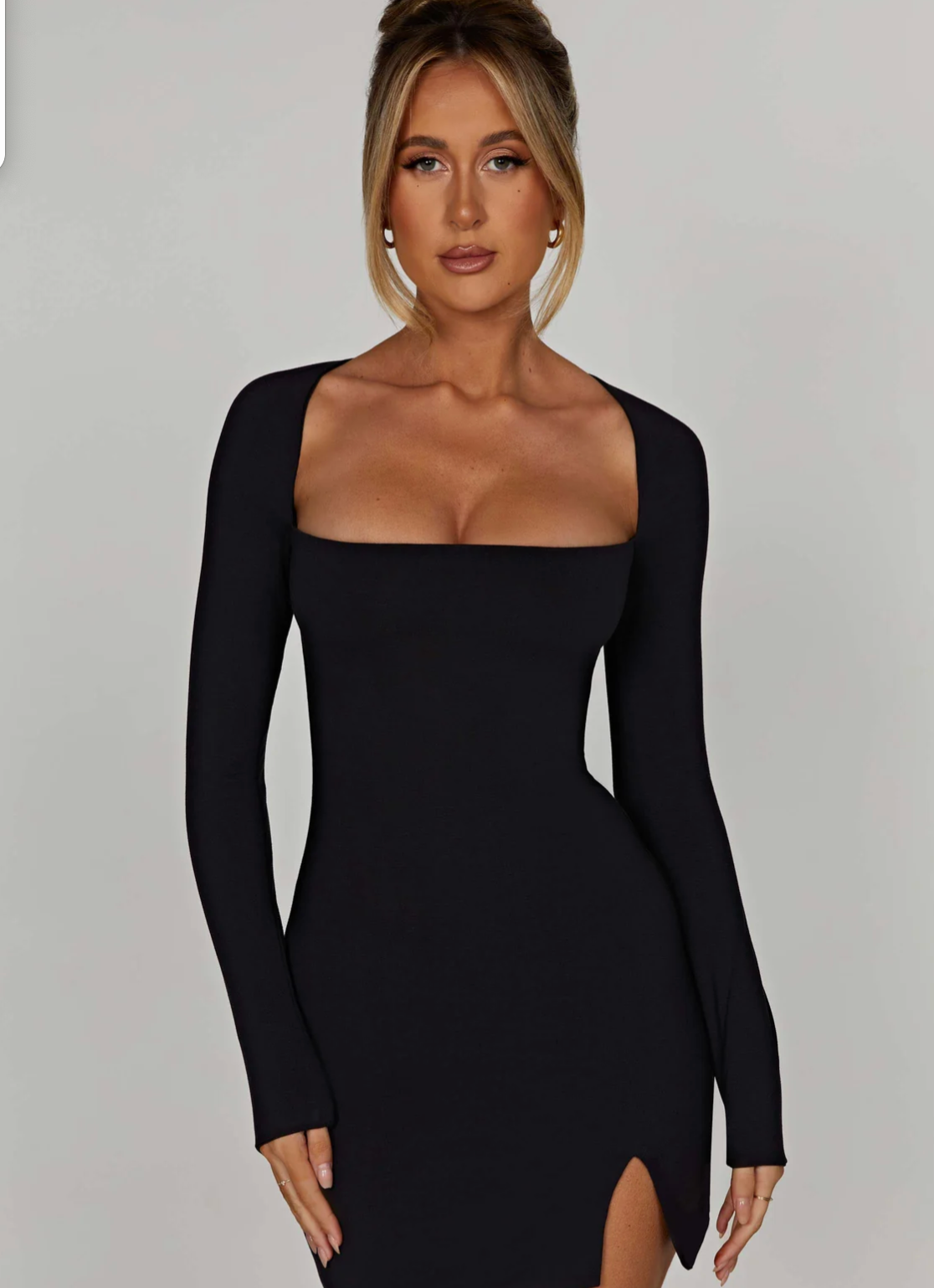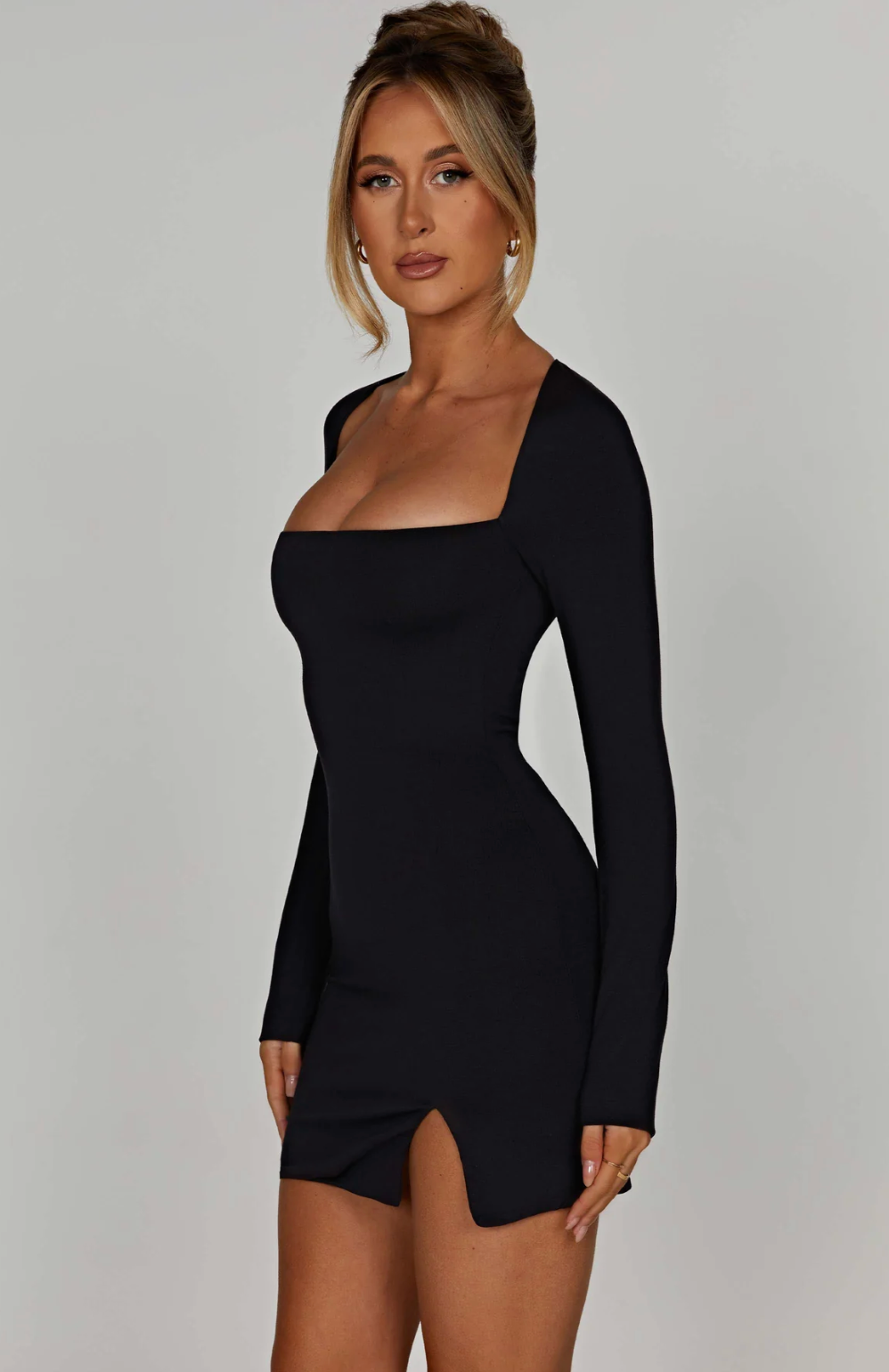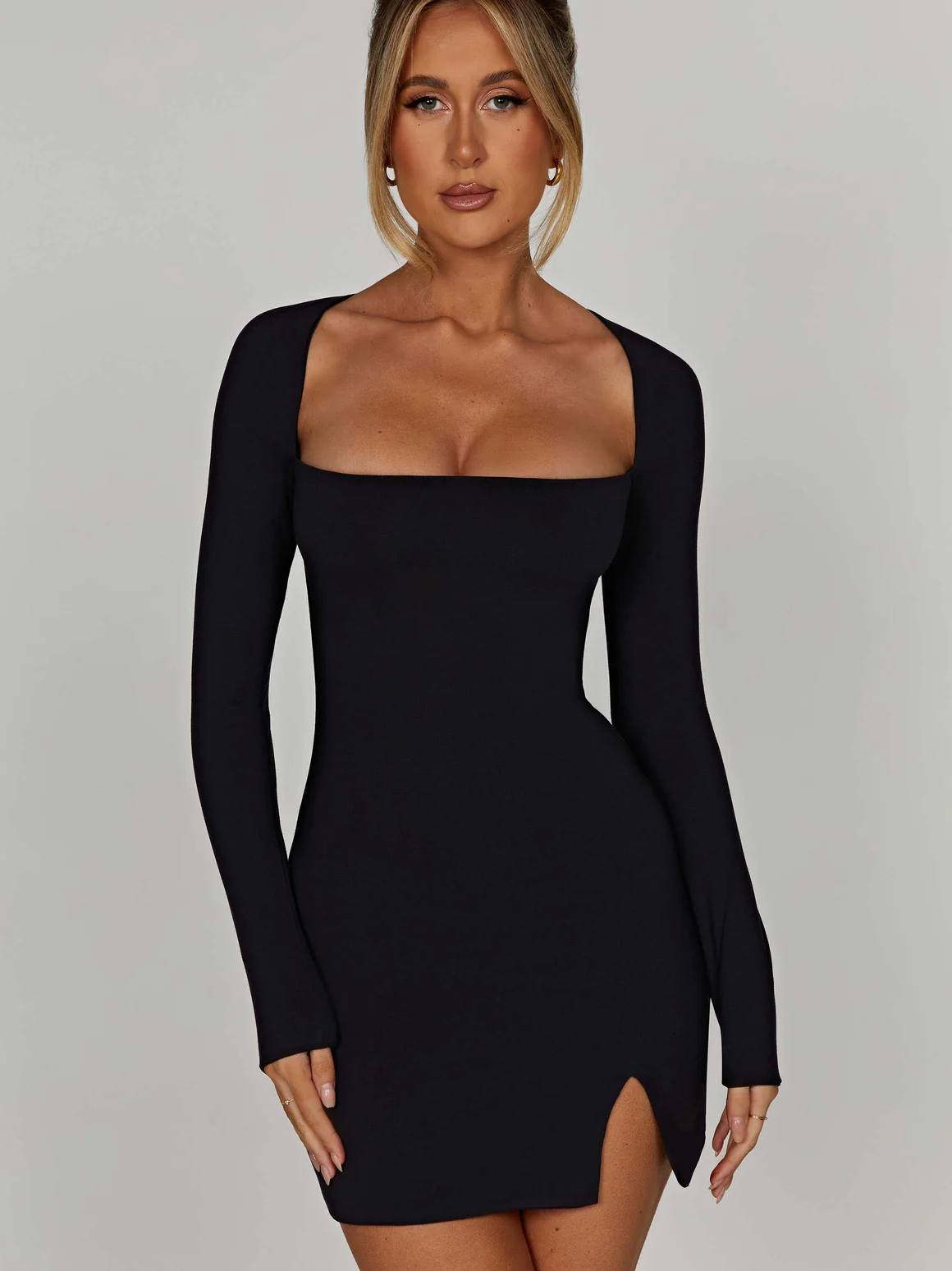 Form Mini er en elegant og sexy svart kjole designet for å fremheve figuren din med selvtillit og stil. Den korte lengden kombinert med en diskret splitt på låret gir en forførende touch, uten å være overdrevet. Kjolen er laget i et mykt og stretchy materiale som sitter pent mot kroppen, og har en enkel, glatt overflate som gjør den lett å style med både hæler og smykker.
