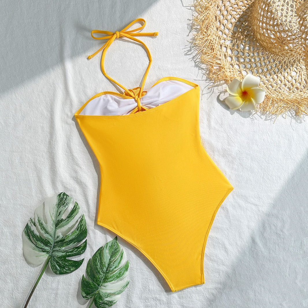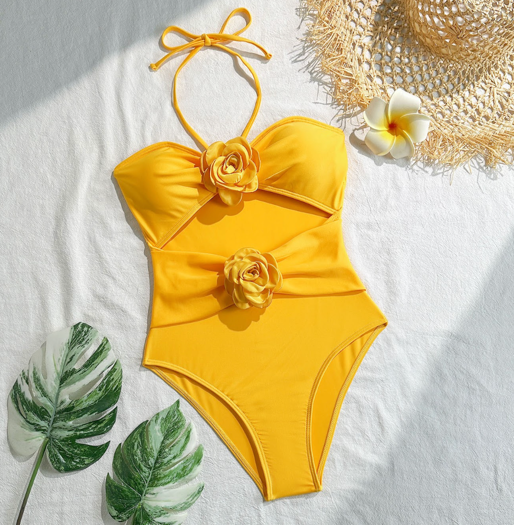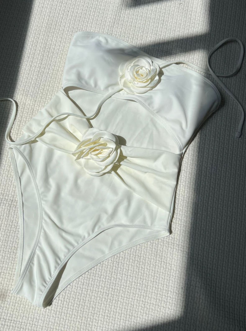 Denne badedrakten er et blikkfang i seg selv. Med en nydelig rose plassert midt på brystet og en strategisk åpning under, kombinerer den romantiske detaljer med en moderne, dristig stil. Den dype utskjæringen i front gir et sensuelt uttrykk, mens den formsydd passformen fremhever figuren på en elegant måte.