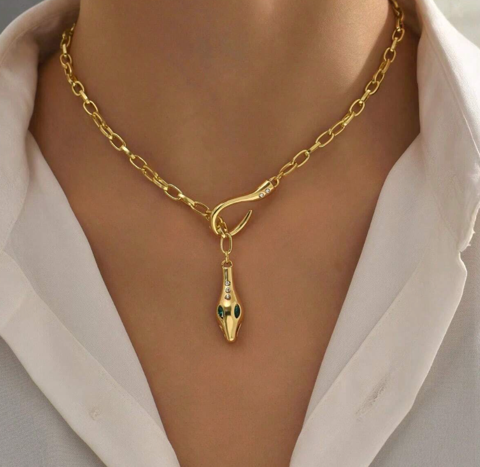 Golden Serpent-kjedet er et elegant og kraftfullt smykke, inspirert av slangens mystikk og tidløse symbolikk. Designet i gull med en jevn og glansfull overflate, smyger kjedet seg vakkert rundt halsen og tilfører en sofistikert og dristig touch til ethvert antrekk. Perfekt for deg som ønsker et smykke med både stil og betydning.