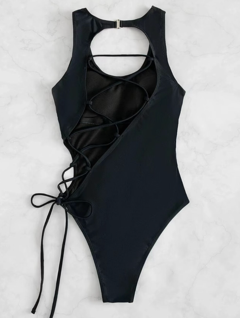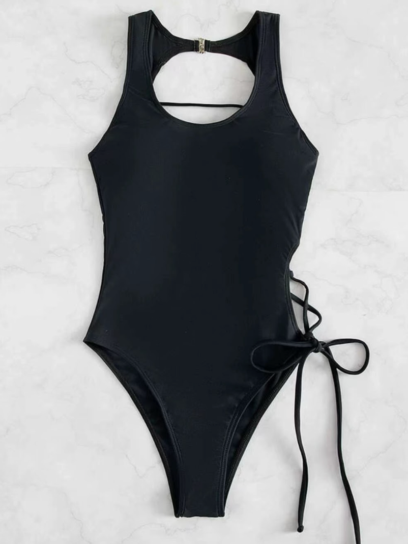 Denne badedrakten kombinerer enkel eleganse med vakre detaljer. Baksiden har delikate åpninger som gir en lett og luftig følelse, mens knytingen i ryggen tilfører et sofistikert og justerbart preg. Snittet former kroppen på en naturlig og flatterende måte – perfekt for solfylte dager med stil.