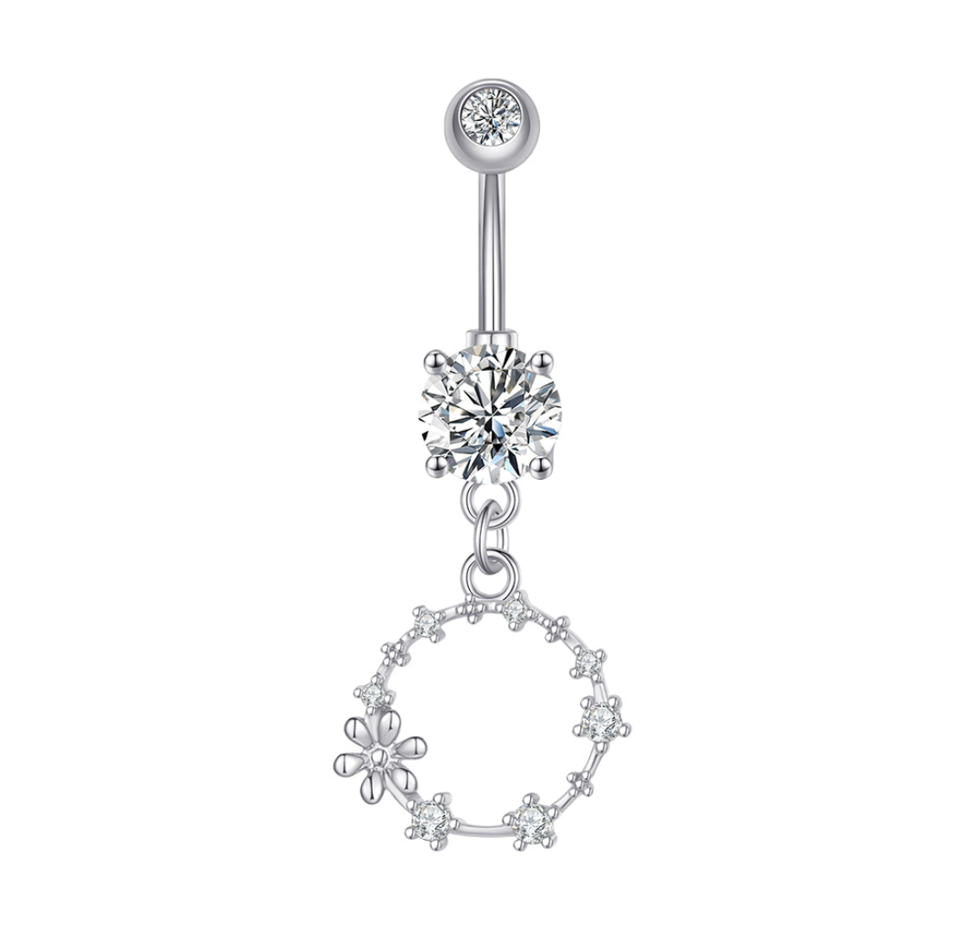 Denne vakre navlepiercingen kombinerer et klassisk heng med moderne eleganse. Det sirkelformede anhenget gir smykket et sofistikert uttrykk, mens de små detaljene og glitrende steinene tilfører en feminin og eksklusiv følelse. Et smykke som virkelig fanger lyset og følger bevegelsen din – perfekt til sommerens antrekk, stranddager og spesielle anledninger.