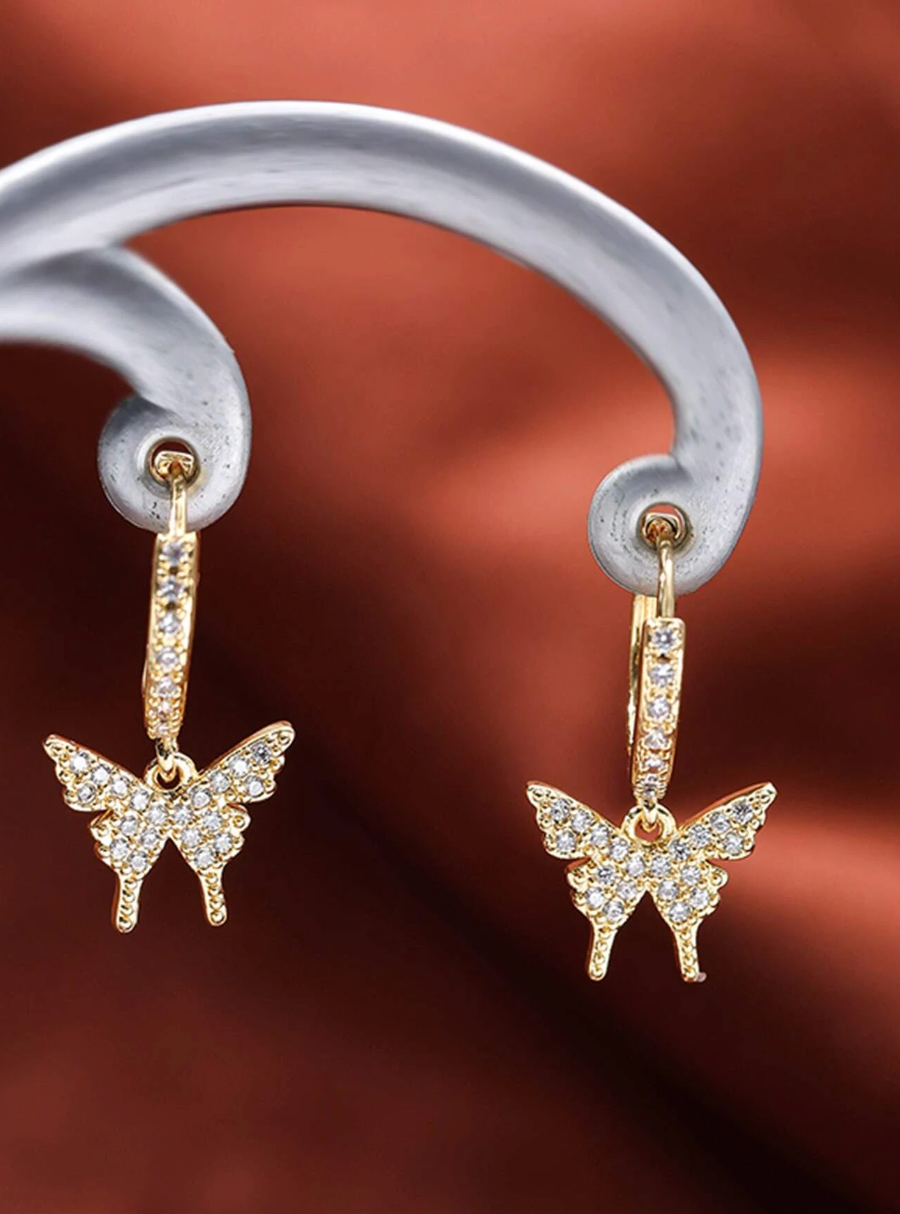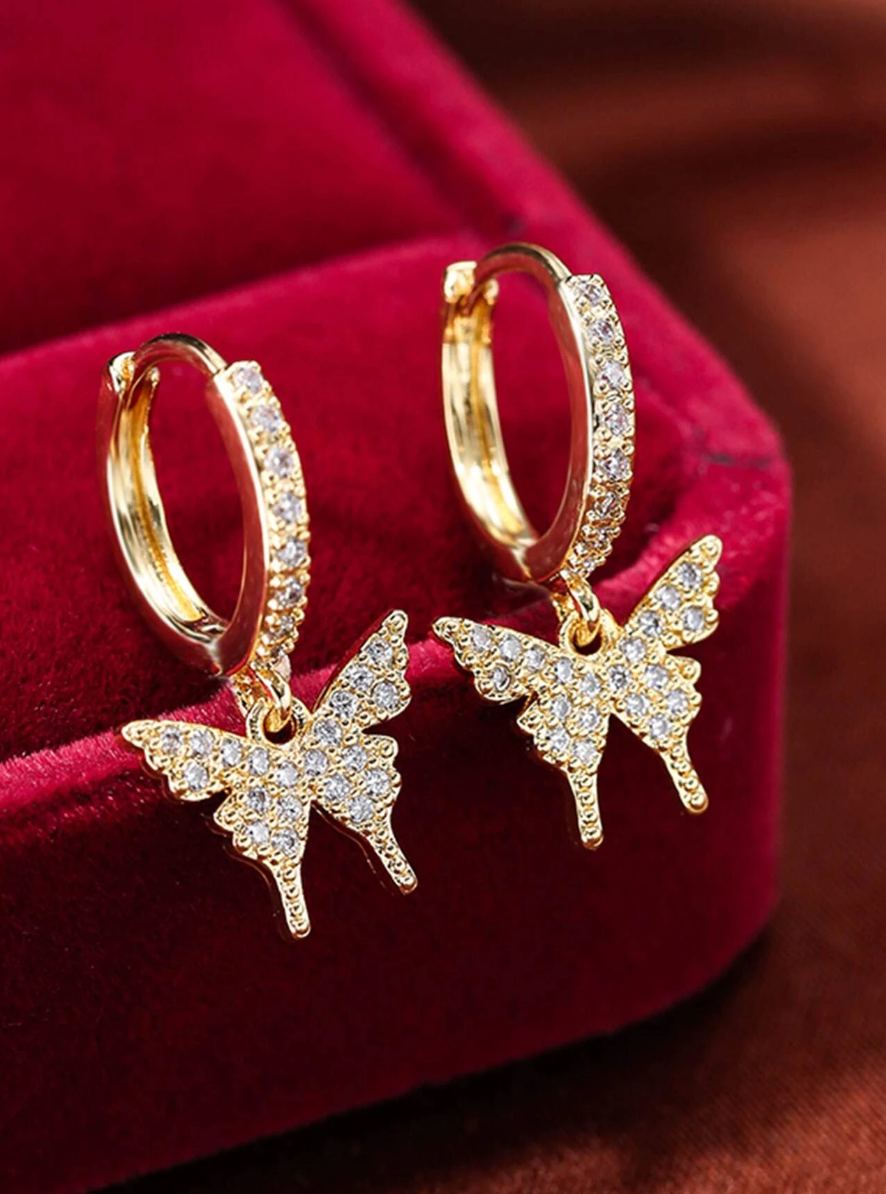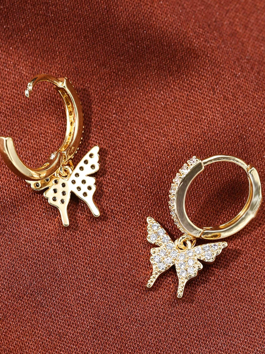 Disse elegante hengende øredobbene har en vakker sommerfugldesign i gull, kombinert med en praktisk ringlukking. Den delikate sommerfuglen henger fritt og gir et lett og luftig preg, perfekt for å tilføre et sofistikert og feminin uttrykk til ethvert antrekk.