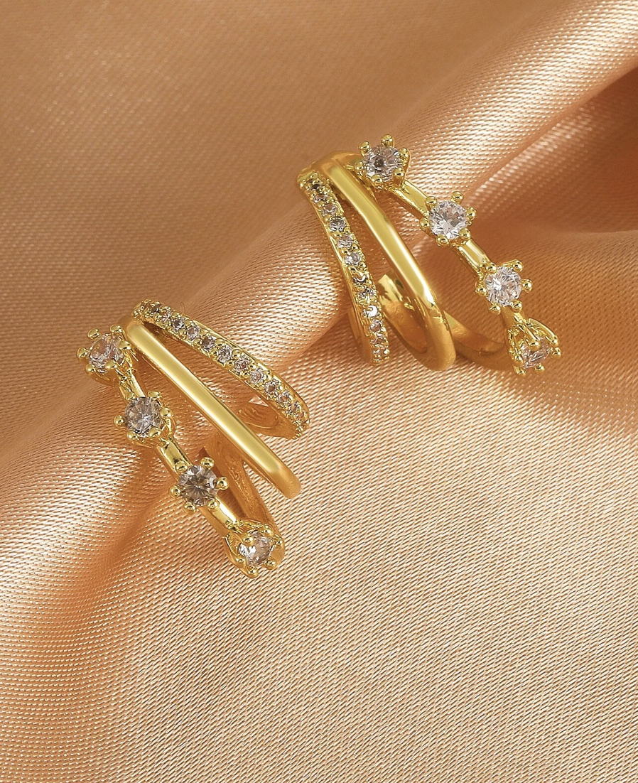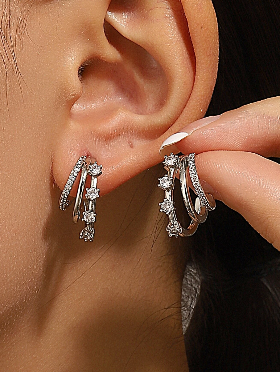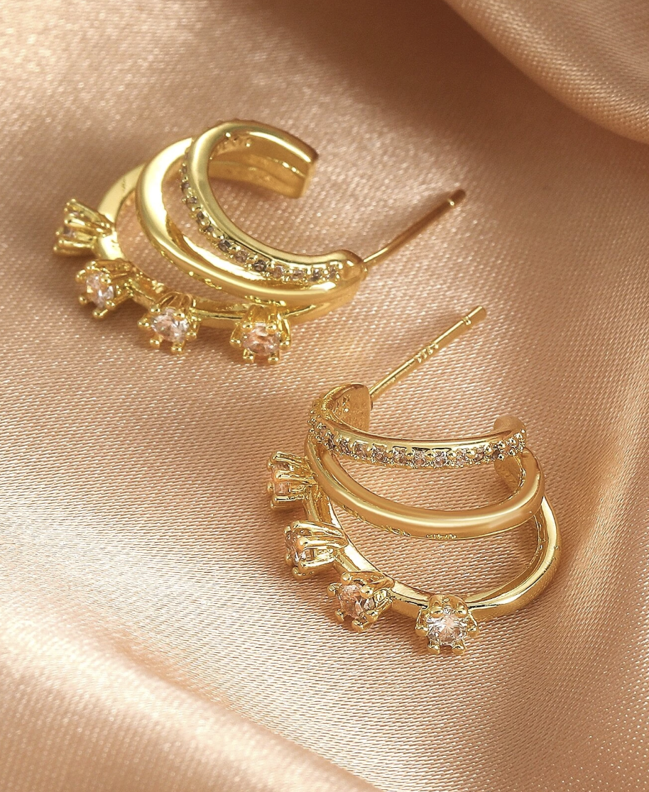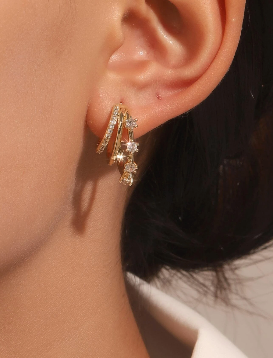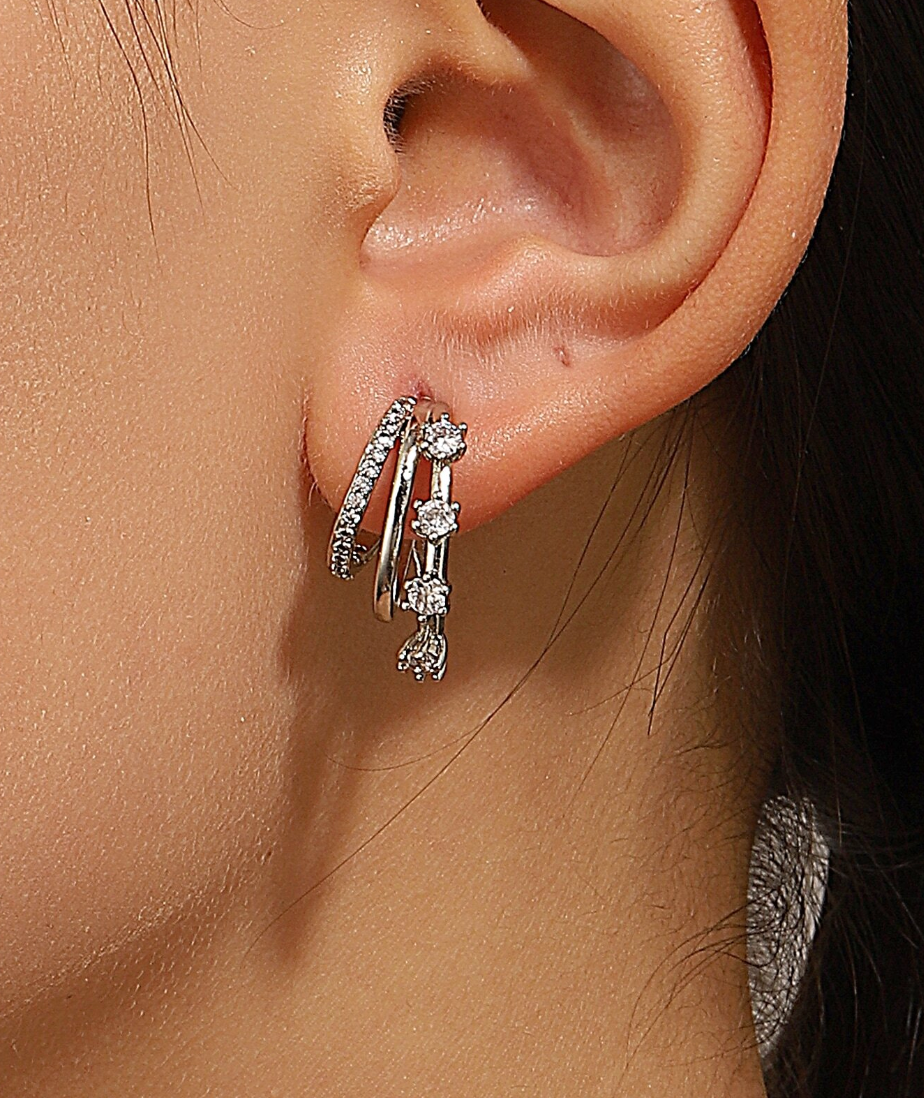Disse elegante øredobbene består av tre sammenkoblede ringer, hvor to er utsmykket med glitrende diamantdetaljer. Både av gull og sølv gir et sofistikert og moderne uttrykk som passer både til hverdagsbruk og spesielle anledninger.