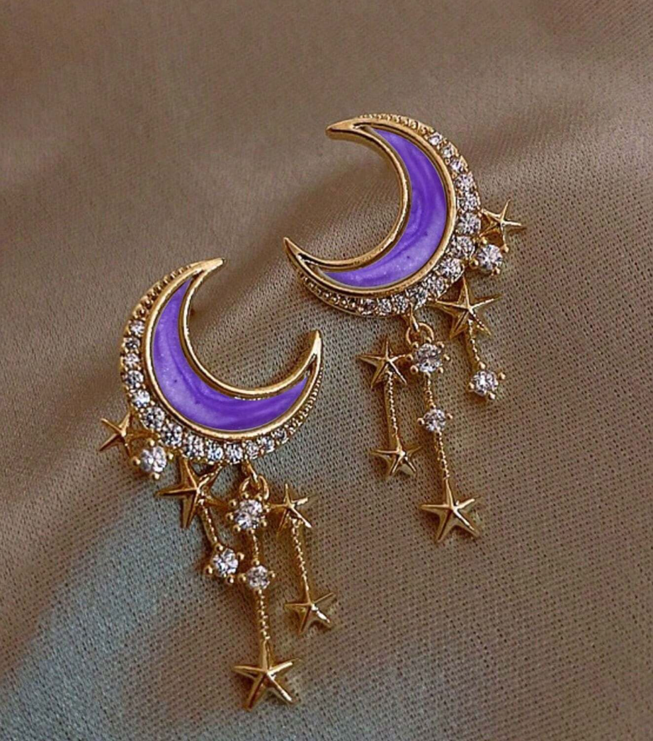 Disse unike måne øredobbene er prydet med hengende små stjerner i flere farger, og gir et magisk og drømmende preg. perfekt for å tilføre et stjernespekket uttrykk til både hverdagsantrekk og spesielle anledninger.