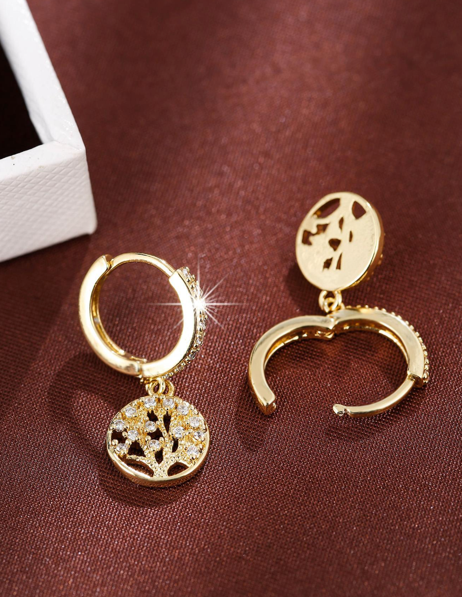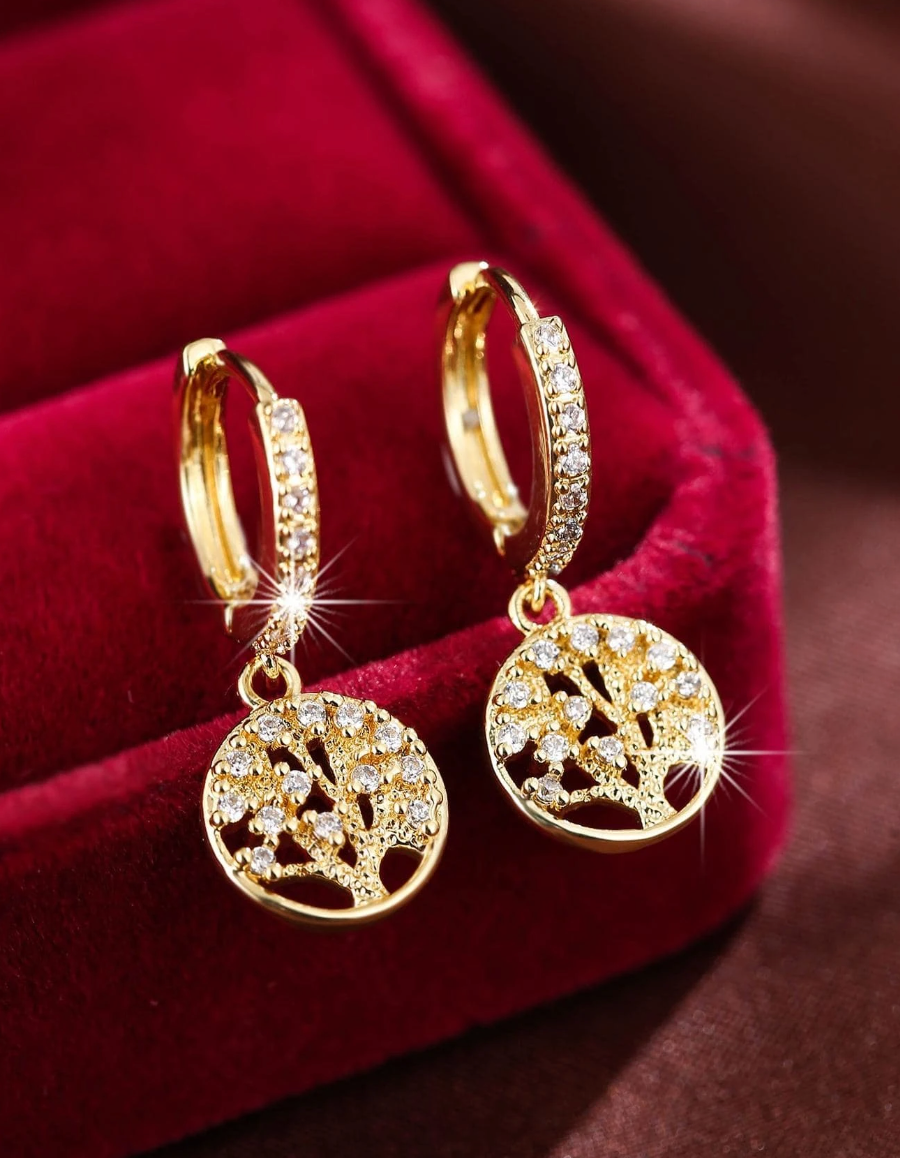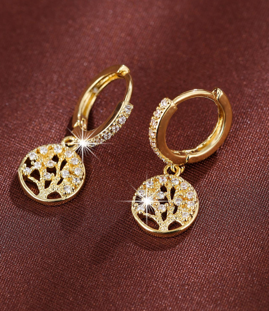 Disse elegante hengende øredobbene har et vakkert tre-motiv i gull, designet for å tilføre et stilfullt og tidløst preg til ethvert antrekk. Øredobbene er utstyrt med en praktisk ringlukking, som sikrer en komfortabel og sikker passform. Perfekte for både hverdagsbruk og spesielle anledninger.