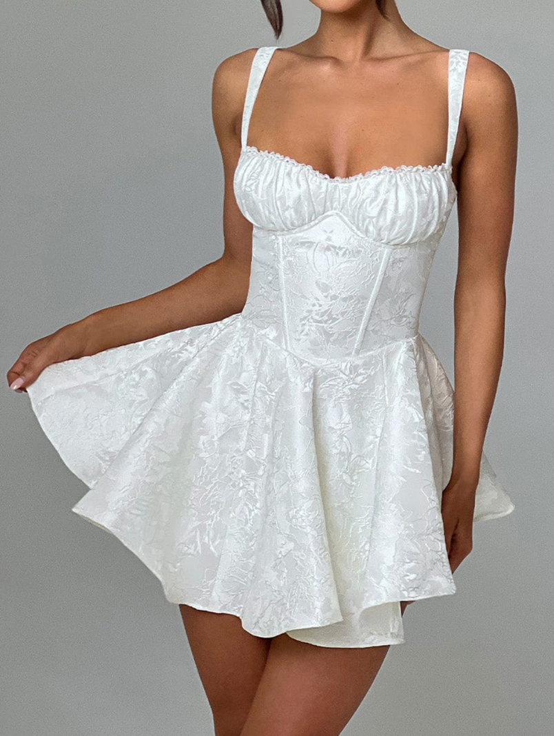 Sløyfesving er kjolen som sier sjarmerende, selvsikker og sommerklar på én gang. Med en åpen rygg og en markant sløyfe bak, gir den et romantisk og flørtende uttrykk – mens det voluminøse skjørtet svinger vakkert når du går. Den korte lengden og den struttende fasongen gjør den perfekt til både sommerfester, ferier og kvelder du vil huskes for.