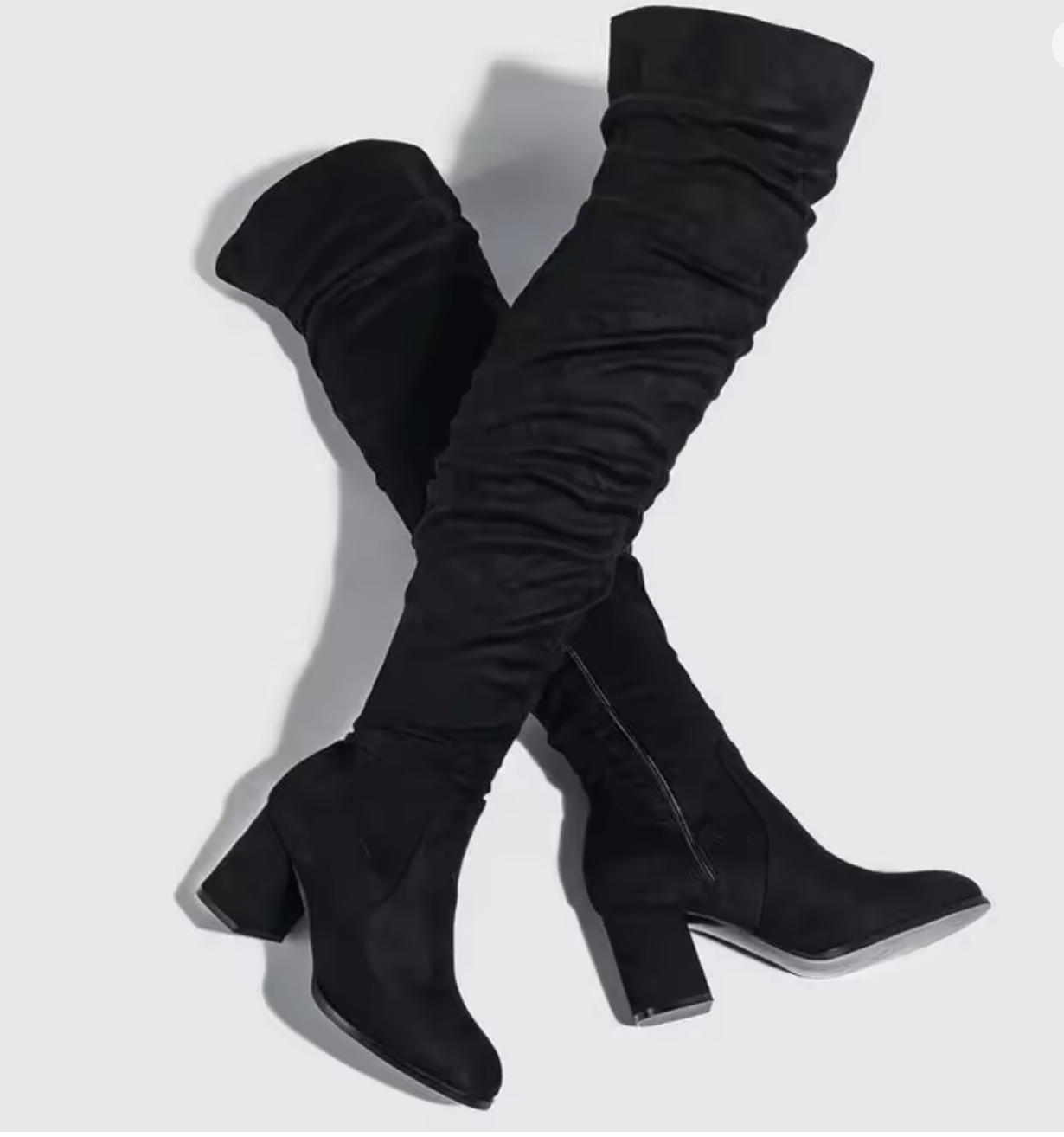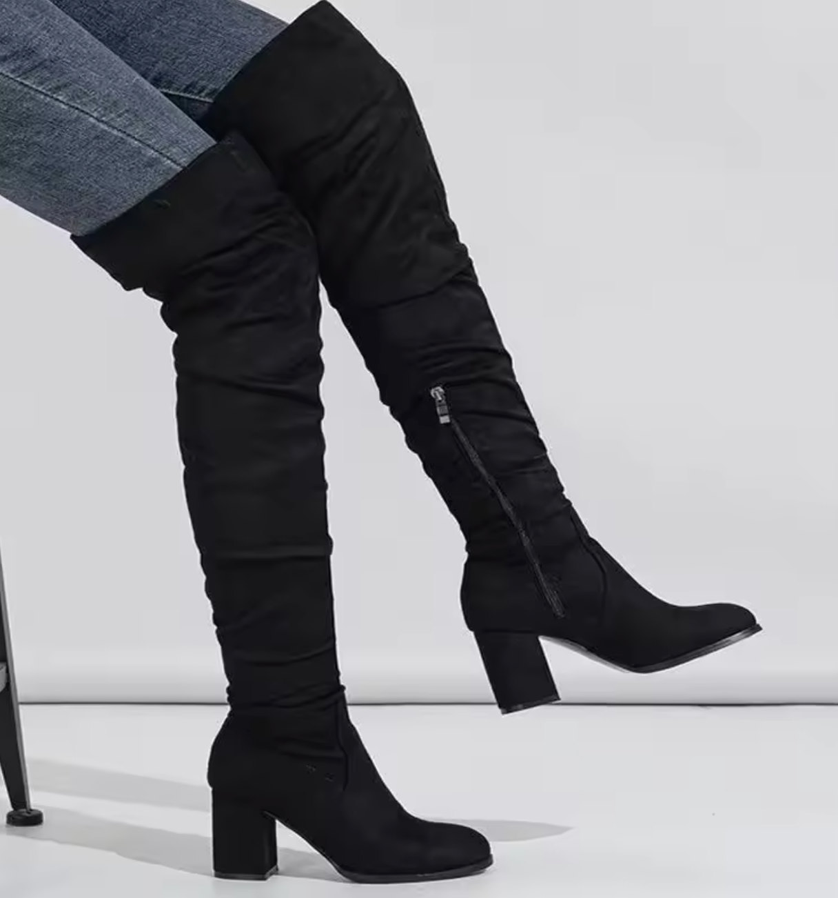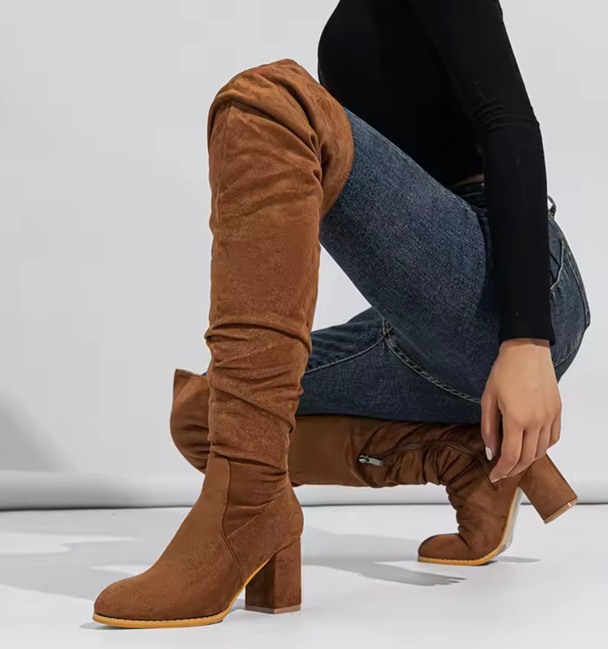 Soriel High Boots er elegante og tidløse over-kneet boots med lave hæler, designet for å gi både komfort og en sofistikert look. Den lange lengden fremhever beina på en flatterende måte, mens de korte hælene gjør dem behagelige nok til å brukes hele dagen.